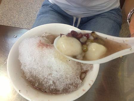 點餐時看到米糕冰就覺得非點不可, 往下一撈, 覺得手感怪怪的, 哇 原來是在熱米糕粥上放挫冰啦, 所以只要一動, 上面的冰與下面的熱粥很快就融在一起, 這樣也不錯耶, 可以吃到不那麼甜的米糕粥說