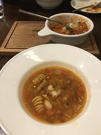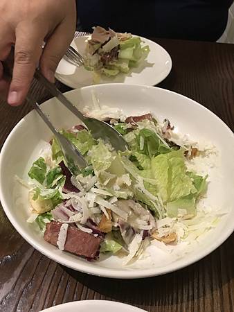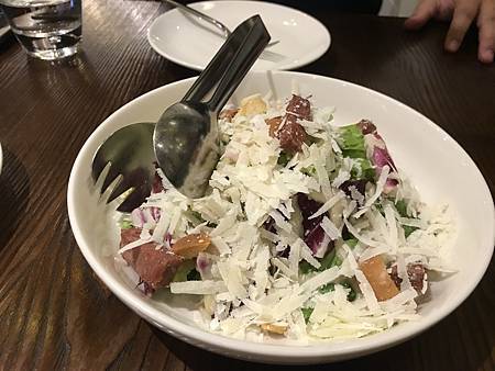 首先上來的沙拉真不錯, 現刨的起司之外, 裏頭的厚培根口感很好又不油膩