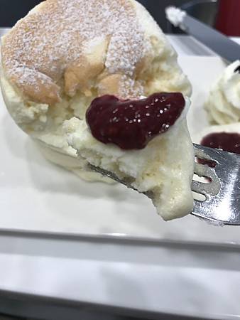 吃舒芙蕾要用挖的再沾果醬, 這果醬不甜膩不很酸, 好吃, 配上奶香濃郁的鬆餅真是絕配