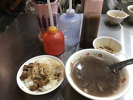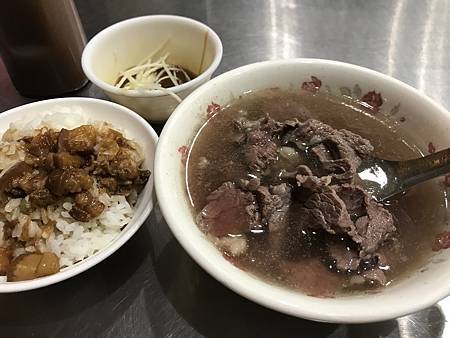 上菜 (都是肉!) 感覺像點心, 先來口湯, 不腥耶, 好喝, 而且牛肉口感也不錯, 而一旁的肉燥飯不是我預期的甜甜台南市肉燥飯, 這個我喜歡
