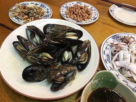 來這裡必點的馬祖淡菜($350), 看到這淡菜真的嚇到, 沒想到台灣竟然也產淡菜耶, 一旁的燙透抽也很棒